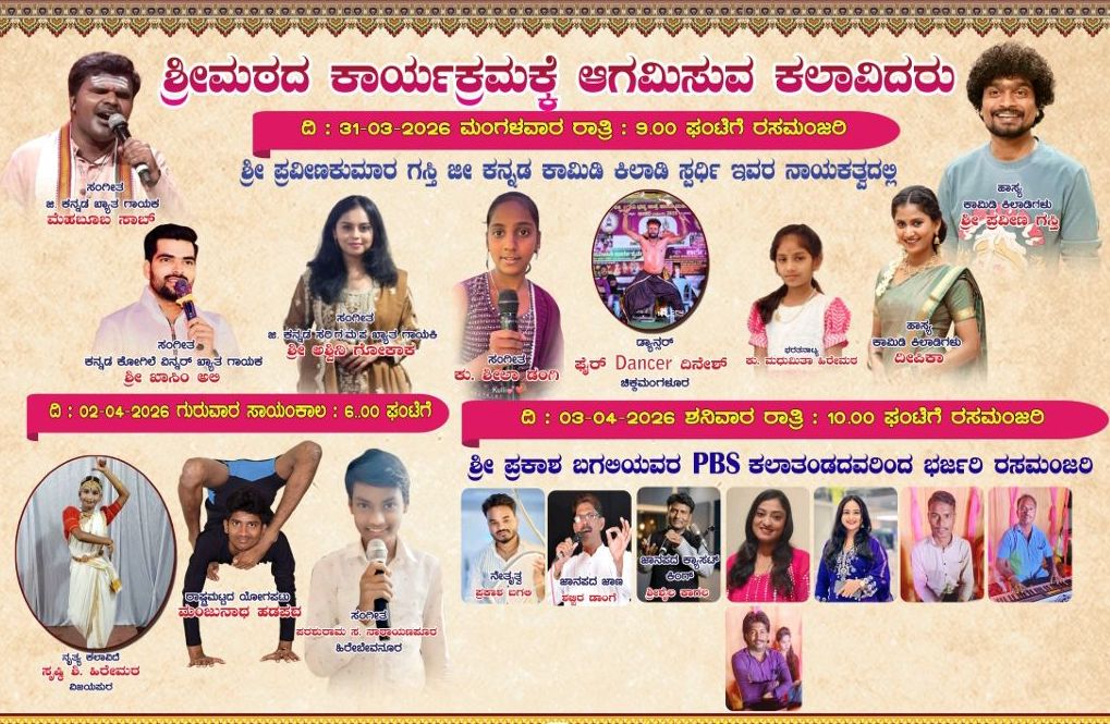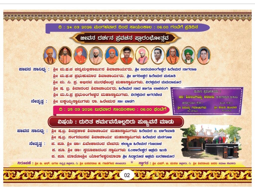 ದಿನಾಂಕ:25-03-2026,ಬುಧವಾರ ಸಾಯಂಕಾಲ 06-00,ಗಂಟೆಗೆ “ದುರಿತ ಕರ್ಮವನೊಲ್ಲದಿರು ಪುಣ್ಯವನೆ ಮಾಡು” ಕಾರ್ಯಕ್ರಮ ನಡೆಯಲಿದ್ದು ಈ ಕಾರ್ಯಕ್ರಮದ ಪಾವನ ಸಾನಿಧ್ಯವನ್ನು ಶ್ರೀ ಷ.ಬ್ರ. ಶಿವಪ್ರಕಾಶ ಶಿವಾಚಾರ್ಯ ಮಹಾಸ್ವಾಮಿಗಳು ಹಿರೇಮಠ ಬ. ಬಾಗೇವಾಡಿ. ಶ್ರೀ ಷ.ಬ್ರ. ಸಂಗನಬಸವ ಶಿವಾಚಾರ್ಯ ಮಹಾಸ್ವಾಮಿಗಳು ಹಿರೇಮಠ ಮನಗೂಳಿ ವಹಿಸುವರು ಈ ಕಾರ್ಯಕ್ರಮದ ನೇತೃತ್ವವನ್ನು ಪ. ಪೂ. ಶ್ರೀ ಡಾ।। ವಿವೇಕಾನಂದ ದೇವರು ಕಲ್ಯಾಣ ಹಿರೇಮಠ ಗುಣದಾಳ. ಪ. ಪೂ. ಶ್ರೀ ಡಾ॥ ಸ್ವರೂಪಾನಂದ ಸ್ವಾಮಿಗಳು ಓಂಕಾರೇಶ್ವರ ಆಶ್ರಮ ಇಂಡಿ. ಪ. ಪೂ. ಮಾತೋಶ್ರೀ ಯೋಗೇಶ್ವರಿಮಾತಾ ಶ್ರೀ ಸಿದ್ಧಾರೂಡ ಆಶ್ರಮ ಬುರಣಾಪೂರ ವಹಿಸುವರು. ಈ ಕಾರ್ಯಕ್ರಮದ ನಿರೂಪಣೆಯನ್ನು ಶ್ರೀ ಡಿ. ಆರ್. ಐಗಣ ನಿವೃತ್ತ ಶಿಕ್ಷಕರು. & ಶ್ರೀ ಬಸವರಾಜ ಹ. ಗಾಣಿಗೇರ ಕಲಾವಿದರು ಮಾಡುವರು ಮತ್ತು ಶ್ರೀ ಎಮ್. ಜಿ. ಮಸಣ ಶಿಕ್ಷಕರು, & ಶ್ರೀ ಶಿವರಾಯ ಐದರಿ ಸಮಾಜ ಸೇವಕರು ಸ್ವಾಗತ ಕೋರುವರು.