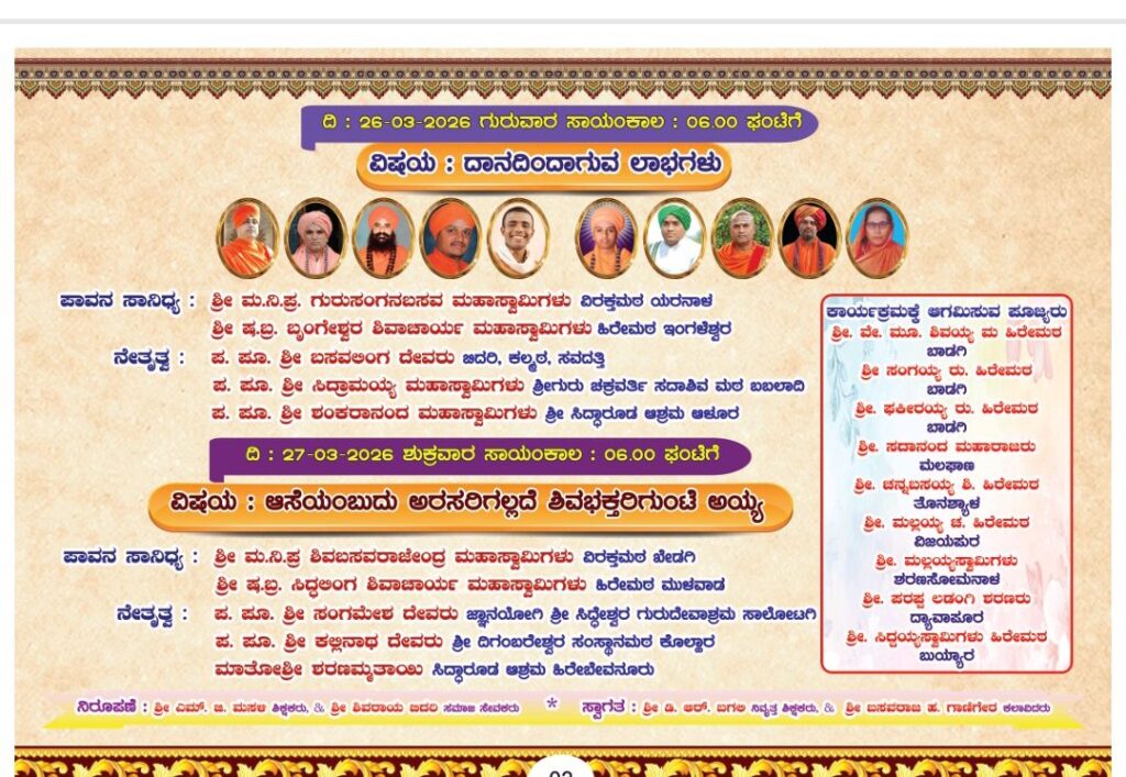 ದಿನಾಂಕ: 26-03-2026 ಸಾಯಂಕಾಲ : 06.00ಗಂಟೆಗೆ” ದಾನದಿಂದಾಗುವ ಲಾಭಗಳು”ಕಾರ್ಯಕ್ರಮ ನಡೆಯುವುದು ಈ ಕಾರ್ಯಕ್ರಮದ ಪಾವನ ಸಾನಿಧ್ಯವನ್ನು ಶ್ರೀ ಮ.ನಿ.ಪ್ರ. ಗುರುಸಂಗನಬಸವ ಮಹಾಸ್ವಾಮಿಗಳು ವಿರಕ್ತಮಠ ಯರನಾಳ. ಶ್ರೀ ಷ.ಬ್ರ. ಬೃಂಗೇಶ್ವರ ಶಿವಾಚಾರ್ಯ ಮಹಾಸ್ವಾಮಿಗಳು ಹಿರೇಮಠ ಇಂಗಳೇಶ್ವರ ರವರು ವಹಿಸುವರು. ಈ ಕಾರ್ಯಕ್ರಮದ ನೇತೃತ್ವವನ್ನು ಪ. ಪೂ. ಶ್ರೀ ಬಸವಲಿಂಗ ದೇವರು ಬಿದರಿ, ಕಲ್ಮಠ, ಸವದತ್ತಿ. ಪ. ಪೂ. ಶ್ರೀ ಸಿದ್ರಾಮಯ್ಯ ಮಹಾಸ್ವಾಮಿಗಳು ಶ್ರೀಗುರು ಚಕ್ರವರ್ತಿ ಸದಾಶಿವ ಮಠ ಬಬಲಾದಿ. ಪ. ಪೂ. ಶ್ರೀ ಶಂಕರಾನಂದ ಮಹಾಸ್ವಾಮಿಗಳು ಶ್ರೀ ಸಿದ್ದಾರೂಡ ಆಶ್ರಮ ಆಳೂರ ರವರು ವಹಿಸುವರು.