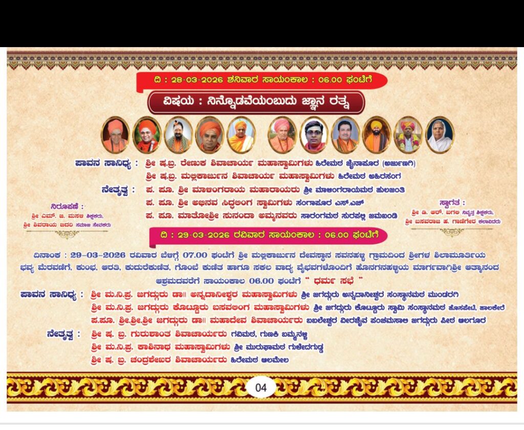 ದಿನಾಂಕ: 28-03-2026 ಶನಿವಾರ ಸಾಯಂಕಾಲ 06.00ಗಂಟೆಗೆ “ನಿನ್ನೊಡವೆಯಂಬುದು ಜ್ಞಾನ ರತ್ನ” ಕಾರ್ಯಕ್ರಮ. ಈ ಕಾರ್ಯಕ್ರಮದ ಪಾವನ ಸಾನಿಧ್ಯವನ್ನು ಶ್ರೀ ಷ.ಬ್ರ. ರೇಣುಕ ಶಿವಾಚಾರ್ಯ ಮಹಾಸ್ವಾಮಿಗಳು ಹಿರೇಮಠ ಜೈನಾಪೂರ (ಅರ್ಜುಣಗಿ). ಶ್ರೀ ಷ.ಬ್ರ. ಮಲ್ಲಿಕಾರ್ಜುನ ಶಿವಾಚಾರ್ಯ ಮಹಾಸ್ವಾಮಿಗಳು ಹಿರೇಮಠ ಅಹಿರಸಂಗ ವಹಿಸುವರು. ಈ ಕಾರ್ಯಕ್ರಮದ ನೇತೃತ್ವವನ್ನು ಪ. ಪೂ. ಶ್ರೀ ಮಾಳಿಂಗರಾಯ ಮಹಾರಾಯರು ಶ್ರೀ ಮಾಳಿಂಗರಾಯಮಠ ಹುಲಜಂತಿ .ಪ. ಪೂ. ಶ್ರೀ ಅಭಿನವ ಸಿದ್ದಲಿಂಗ ಸ್ವಾಮಿಗಳು ಸಂಗಾಪೂರ ಎಸ್.ಎಚ್. ಪ. ಪೂ. ಮಾತೋಶ್ರೀ ಸುನಂದಾ ಅಮ್ಮನವರು ಸಾರಂಗಮಠ ಸುರಪಲ್ಲಿ ಜಮಖಂಡಿ.