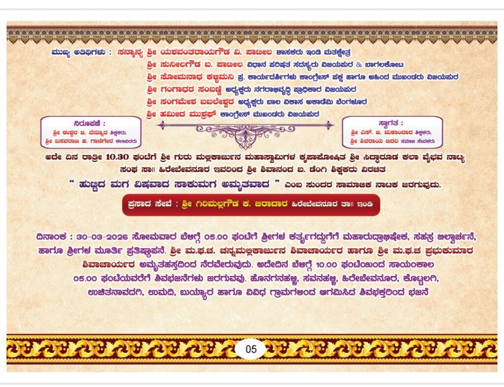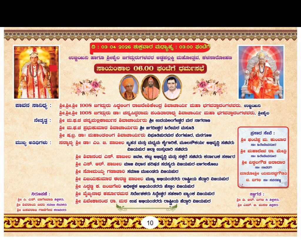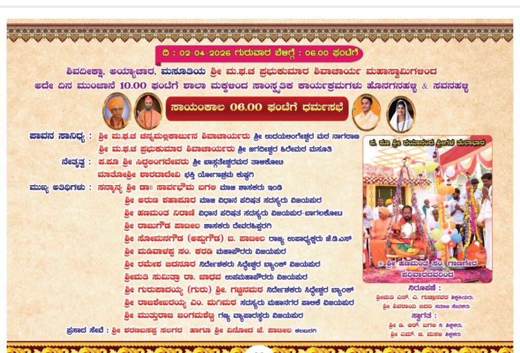 ದಿ : 03-04-2026 ಶುಕ್ರವಾರ ಮಧ್ಯಾಹ್ನ : 03.00 ಘಂಟೆಗೆ. ಉಜ್ಜಯಿನಿ ಹಾಗೂ ಶ್ರೀಶೈಲ ಜಗದ್ಗುರುಗಳವರ ಅಡ್ಡಪಲ್ಲಕ್ಕಿ ಮಹೋತ್ಸವ, ಕಳಸಾರೋಹಣ. ಸಾಯಂಕಾಲ 06.00 ಘಂಟೆಗೆ ಧರ್ಮಸಭೆ. ಪಾವನ ಸಾನಿಧ್ಯ :ಶ್ರೀ.ಶ್ರೀ.ಶ್ರೀ 1008 ಜಗದ್ಗುರು ಸಿದ್ಧಲಿಂಗ ರಾಜದೇಶಿಕೇಂದ್ರ ಶಿವಾಚಾರ್ಯ ಮಹಾ ಭಗವತ್ಪಾದಂಗಳವರು, ಉಜ್ಜಯಿನಿ. ಶ್ರೀ.ಶ್ರೀ.ಶ್ರೀ 1008 ಜಗದ್ಗುರು ಡಾ|| ಚನ್ನಸಿದ್ದರಾಮ ಪಂಡಿತಾರಾಧ್ಯ ಶಿವಾಚಾರ್ಯ ಮಹಾ ಭಗವತ್ಪಾದಂಗಳವರು, ಶ್ರೀಶೈಲ.ನೇತೃತ್ವ :ಶ್ರೀ ಮ.ಘ.ಚ ಚನ್ನಮಲ್ಲಿಕಾರ್ಜುನ ಶಿವಾಚಾರ್ಯರು ಶ್ರೀ ಉದಯಲಿಂಗೇಶ್ವರ ಮಠ ನಾಗಠಾಣ. ಶ್ರೀ ಮ.ಘ.ಚ ಪ್ರಭುಕುಮಾರ ಶಿವಾಚಾರ್ಯರು ಶ್ರೀ ಜಗದೀಶ್ವರ ಹಿರೇಮಠ ಮಸೂತಿ. ಶ್ರೀ ಷ.ಬ್ರ. ಡಾ|| ಮಹಾಂತಲಿಂಗ ಶಿವಾಚಾರ್ಯರು ವಿಭೂತಿಪುರಮಠ ಬೆಂಗಳೂರ, ಮನಗೂಳಿ. ಮುಖ್ಯ ಅತಿಥಿಗಳು :ಸನ್ಮಾನ್ಯ ಶ್ರೀ ಡಾ| ಎಂ. ಬಿ. ಪಾಟೀಲ ಬೃಹತ ಮತ್ತು ಮಧ್ಯಮ ಕೈಗಾರಿಕೆ, ಮೂಲಸೌಕರ್ಯ ಅಭಿವೃದ್ಧಿ ಸಚಿವರು ವಿಜಯಪುರ ಜಿಲ್ಲಾ ಉಸ್ತುವಾರಿ ಸಚಿವರು. ಶ್ರೀ ಶಿವಾನಂದ ಎಸ್. ಪಾಟೀಲ ಜವಳಿ, ಕಬ್ಬು ಅಭಿವೃದ್ಧಿ ಮತ್ತು ಸಕ್ಕರೆ ಸಚಿವರು ಕರ್ನಾಟಕ ಸರ್ಕಾರ. ಶ್ರೀ ಎಸ್. ಆರ್. ಪಾಟೀಲ ಮಾಜಿ ವಿಧಾನ ಪರಿಷತ ಸದಸ್ಯರು ವಿಜಯಪುರ-ಬಾಗಲಕೋಟ. ಶ್ರೀ ಸೋಮಯ್ಯ ಗಣಾಚಾರಿ ಸಮಾಜ ಮುಖಂಡರು ವಿಜಯಪುರ. ಶ್ರೀ ವಿಜಯಕುಮಾರ ಈರಣ್ಣ ಪಾಟೀಲ ಮುಖ್ಯ ಅಭಿಯಂತರರು ರಾಷ್ಟ್ರೀಯ ಹೆದ್ದಾರಿ ವಿಜಯಪುರ. ಶ್ರೀ ಸಿದ್ದಣ್ಣ ಕ. ಜಿಂಜಗೇರಿ ಅಧೀಕ್ಷಕ ಅಭಿಯಂತರರು ಹೆಸ್ಲಾಂ ವಿಜಯಪುರ. ಶ್ರೀ ವೈಜನಾಥ ಕರ್ಪೂರಮಠ ನಿರ್ದೇಶಕರು ಸಿದ್ಧೇಶ್ವರ ಸಹಕಾರಿ ಬ್ಯಾಂಕ ವಿಜಯಪುರ. ಶ್ರೀ ವಿವೇಕಾನಂದ ರಾ. ಮಠ ಉಪ ಅಭಿಯಂತರರು ರಾಷ್ಟ್ರೀಯ ಹೆದ್ದಾರಿ ವಿಜಯಪುರ. ಪ್ರಸಾದ ಸೇವೆ :ಶ್ರೀ ಫಂಟೆಪ್ಪ ಮ. ಕುಂಬಾರ ಸಾ। ಹಿರೇಬೇವನೂರ. ಶ್ರೀ ಮಹಾದೇವ ರಾ. ಮೇತ್ರಿ ಸಾ।। ಹಿರೇಬೇವನೂರ. ಶ್ರೀ ವಿಠಲಗೌಡ ಬಿರಾದಾರ ಸಾ॥ ನಾವದಗಿ. ಮಾತೋಶ್ರೀ ಯಮನವ್ವಗೌಡತಿ ಐ. ಬಗಲಿ ಸಾಃ ಸವನಹಳ್ಳಿ.