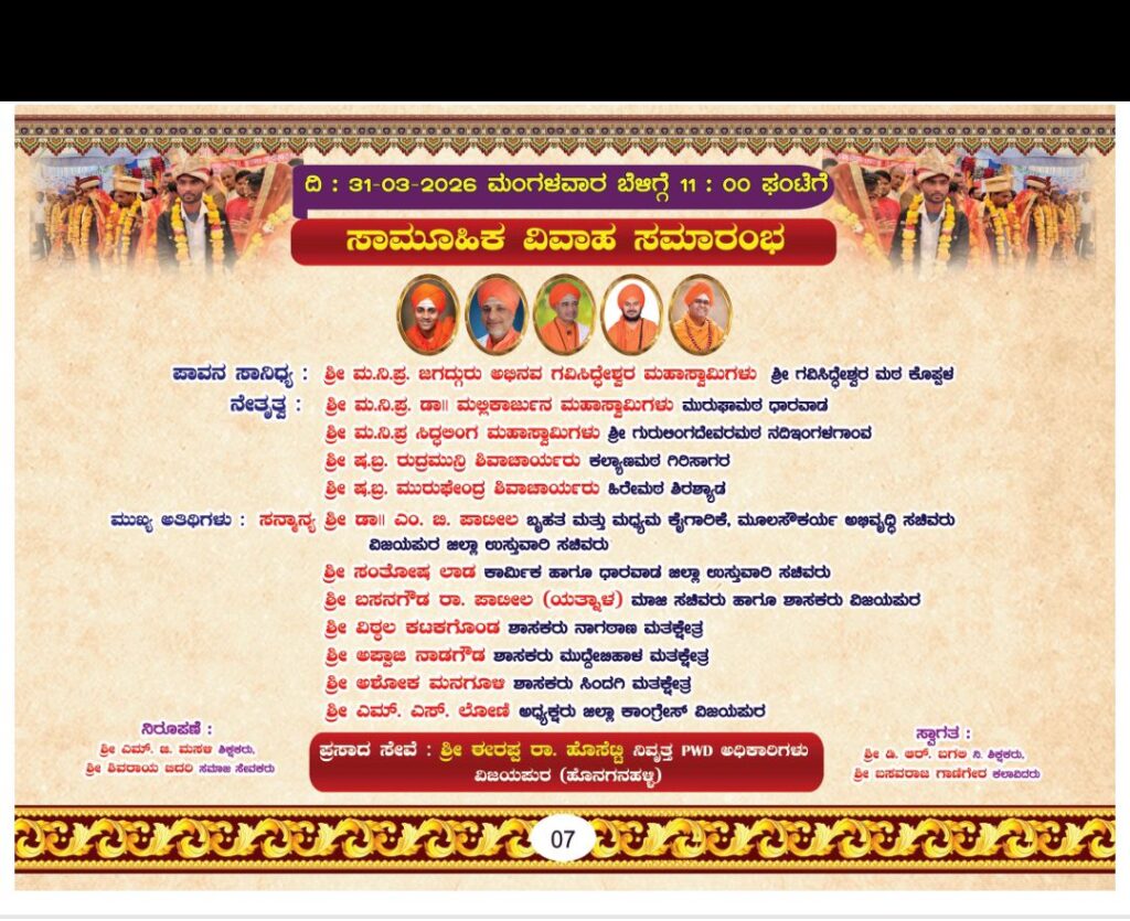 ದಿನಾಂಕ: 31-03-2026 ಮಂಗಳವಾರ ಬೆಳಿಗ್ಗೆ 11 : 00 ಘಂಟೆಗೆ “ಸಾಮೂಹಿಕ ವಿವಾಹ ಸಮಾರಂಭ”