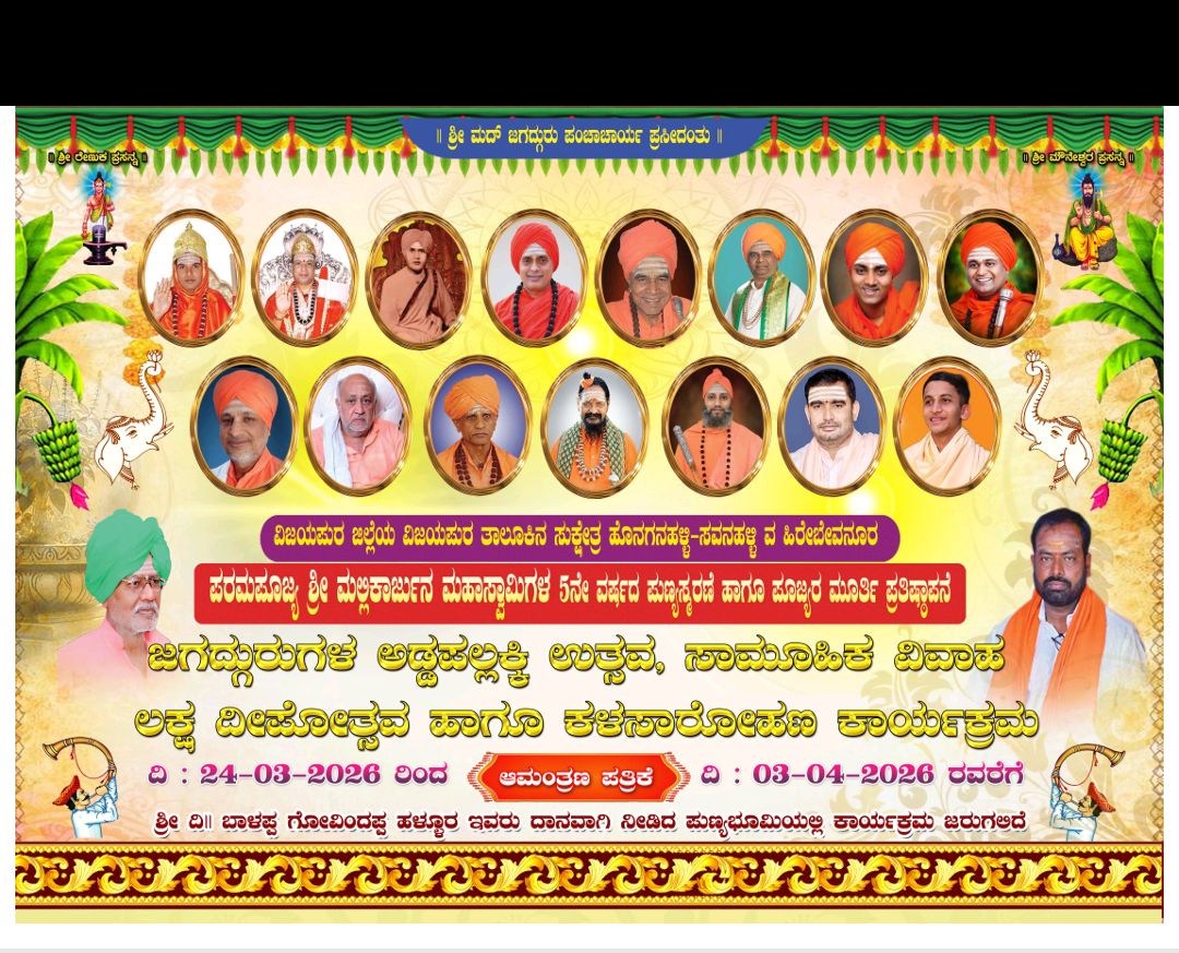 ವಿಜಯಪುರ:ವಿಜಯಪುರ ಜಿಲ್ಲೆಯ ವಿಜಯಪುರ ತಾಲೂಕಿನ ಸುಕ್ಷೇತ್ರ ಹೊನಗನಹಳ್ಳಿ-ಸವನಹಳ್ಳಿ ಯಲ್ಲಿ ದಿನಾಂಕ:24-03-2026,ರಿಂದ ದಿನಾಂಕ: 03-04-2026,ರವರೆಗೆ ಹಿರೇಬೇವನೂರ ಪರಮಪೂಜ್ಯ ಶ್ರೀ ಮಲ್ಲಿಕಾರ್ಜುನ ಮಹಾಸ್ವಾಮಿಜಿಯವರ ಐದನೇ ವರ್ಷದ ಪುಣ್ಯಸ್ಕರಣೆ ನಿಮಿತ್ಯ ಶೂಜ್ವರ ಪುತ್ಥಳಿ ಪ್ರತಿಷ್ಠಾಪನೆ,ಜಗದ್ಗುರುಗಳ ಅಡ್ಡಪಲ್ಲಕ್ಕಿ ಉತ್ಸವ, ಸಾಮೂಹಿಕ ವಿವಾಹ, ಲಕ್ಷ ದೀಪೋತ್ಸವ ಹಾಗೂ ಕಳಸಾರೋಹಣ ಕಾರ್ಯಕ್ರಮಗಳನ್ನು ಹಮ್ಮಿಕೊಳ್ಳಲಾಗಿದೆ.ಈ ಕಾರ್ಯಕ್ರಮವು ಕೃಷ್ಣಾಮೇಲ್ದಂಡೆ ಯೋಜನೆಯ ಸಂತ್ರಸ್ತರಾದ ಶ್ರೀ ದಿ|| ಬಾಳಪ್ಪ ಗೋವಿಂದಪ್ಪ ಹಳ್ಳೂರ ಇವರು ದಾನವಾಗಿ ನೀಡಿದ ಪುಣ್ಯಭೂಮಿಯಲ್ಲಿ ಕಾರ್ಯಕ್ರಮ ಜರುಗಲಿವೆ.